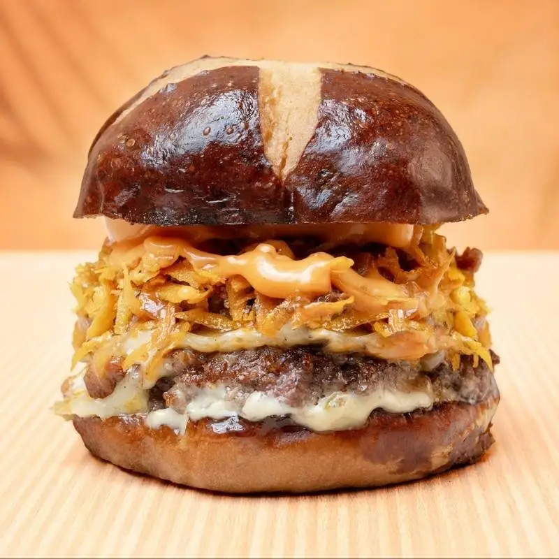 Descripción: Te presentamos tropicalia, inspirada en el son latino: ritmo, mezcla y carácter. Pan pretzel original, nuestra jugosa carne de res, queso gouda fundido, mayonesa de miso y pepinillos butter, cebolla parrillada en mantequilla con trozos de tocineta ahumada, batata y arracacha crispy y nuestra salsa tropicalia a base de pimientos: dulce, ácida y ligeramente picante. El ritmo convertido en fuego. 📍 Ubicación: Carrera 10A #6-17, Zipaquirá
